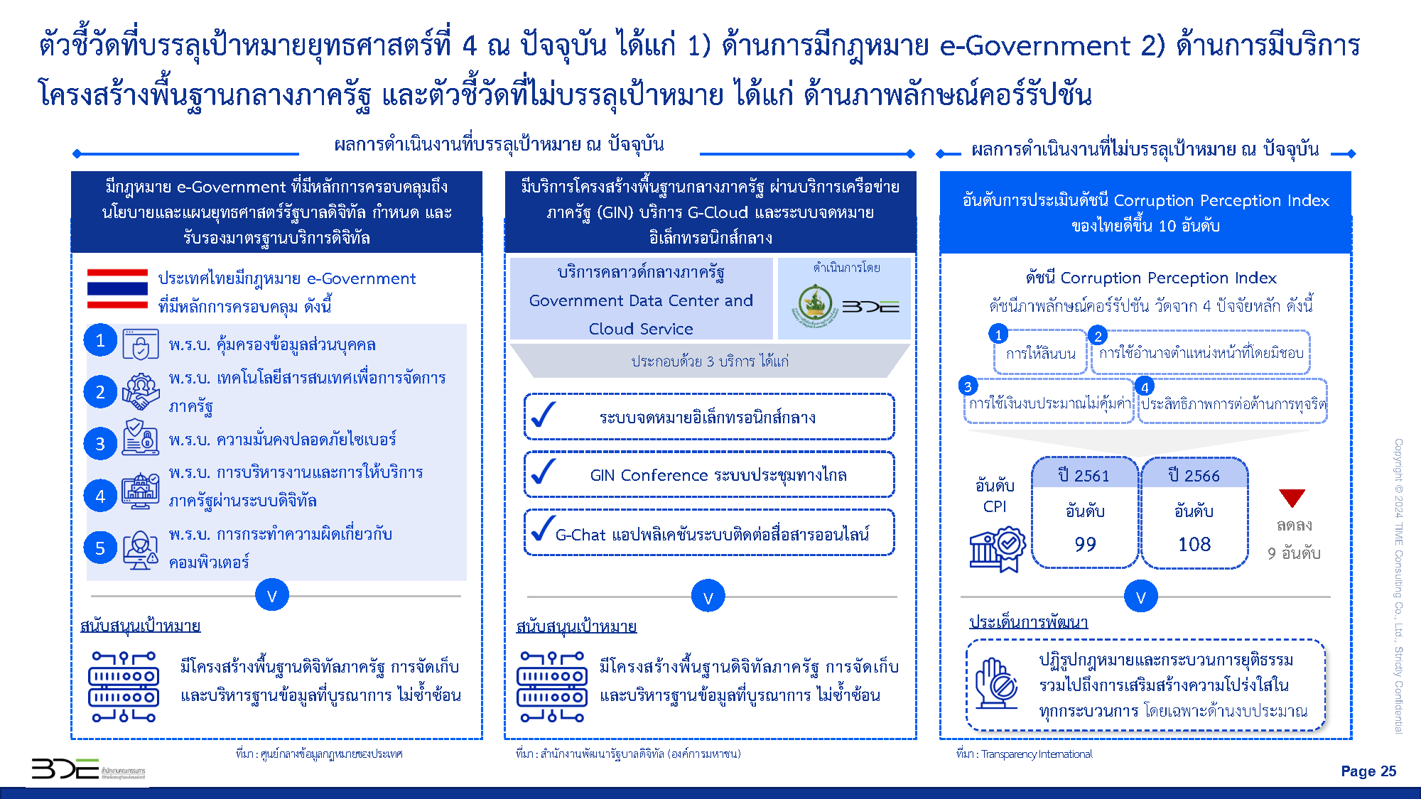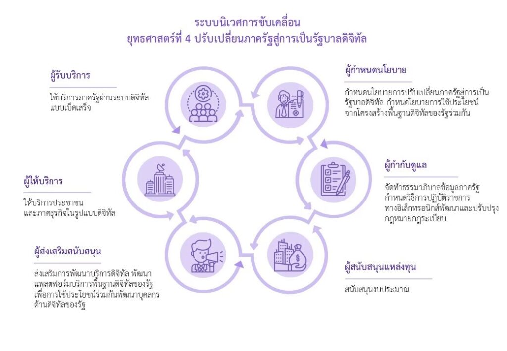 การปรับเปลี่ยนภาครัฐสู่การเป็นรัฐบาลดิจิทัลมุ่งเน้นการใช้เทคโนโลยีดิจิทัลในกระบวนการทำงานและการให้บริการภาครัฐ สร้างบริการของภาครัฐที่มีธรรมาภิบาล สามารถให้บริการประชาชนแบบเบ็ดเสร็จ ณ จุดเดียว ผ่านระบบเชื่อมโยงข้อมูลอัตโนมัติ และมีแพลตฟอร์มกลางเชื่อมโยงข้อมูลบริการระหว่างหน่วยงานของภาครัฐทั้งส่วนกลาง ส่วนภูมิภาค และส่วนท้องถิ่น โดยมุ่งเน้นองค์กรปกครองส่วนท้องถิ่นเป็นกลไกการขับเคลื่อนสำคัญสำหรับการปรับเปลี่ยนภาครัฐสู่การเป็นรัฐบาลดิจิทัล เพื่ออำนวยความสะดวกให้ผู้ใช้บริการและสามารถให้บริการแก่ประชาชนทุกคนได้อย่างเท่าเทียม รวมถึงสามารถตอบสนองความต้องการของทุกภาคส่วนได้อย่างแท้จริง ทั้งภาคประชาชน ภาคเอกชน และภาครัฐด้วยกัน ตลอดจนมีกฎหมายและกฎระเบียบที่เอื้อต่อการดำเนินงานด้วยเทคโนโลยีดิจิทัลและทำให้การเปิดเผยข้อมูลของภาครัฐ ไม่กระทบต่อสิทธิส่วนบุคคลและความมั่นคงของชาติ